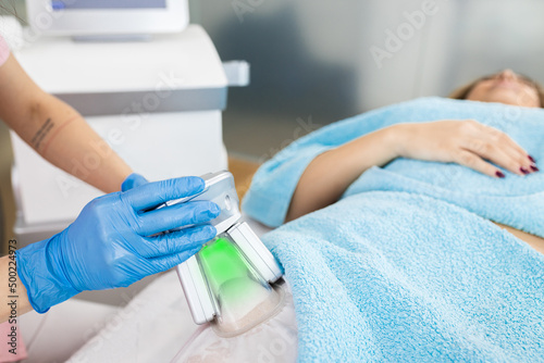 Beautician therapist applying cryolipolysis treatment in beauty salon.