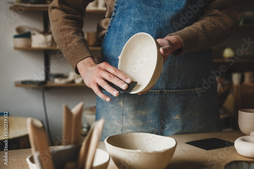 Pottery making studio workshop, hands making ceramic bowl ready for further roasting