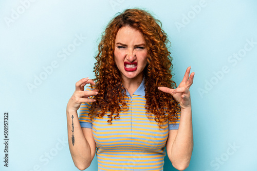 Young ginger caucasian woman isolated on blue background upset screaming with tense hands.