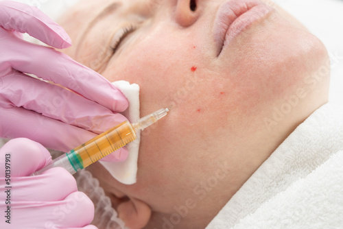 Cosmetologist makes prp-therapy blood plasma against wrinkles around the eyes and skin aging on the face of an adult woman Real procedure. The concept of cosmetology.