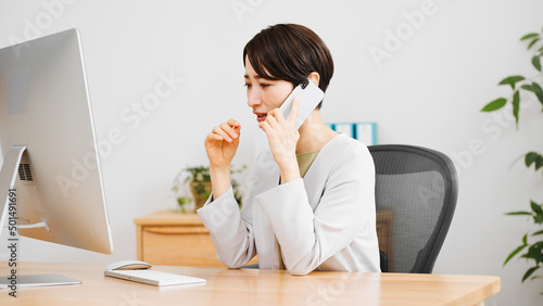 通話相手に謝罪をする若いビジネスウーマン