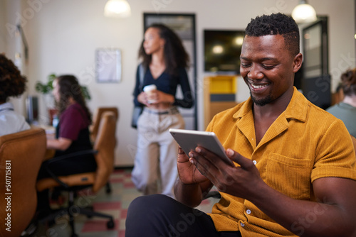A Black businessman scrolls on his tablet in a busy diverse office