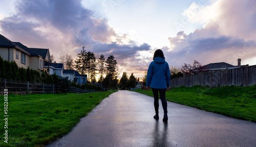 Woman walking on a path in a residential neighborhood of modern city suburbs. Fraser Heights, Surrey, Vancouver, BC, Canada.