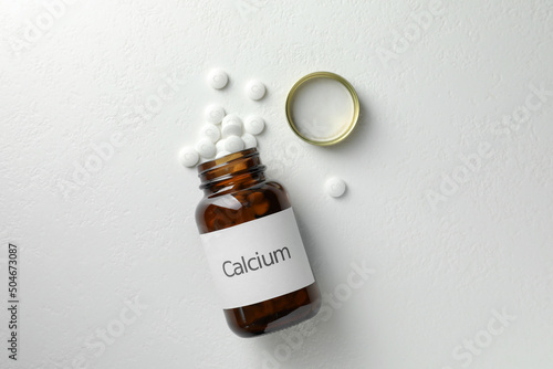 Overturned bottle of calcium supplement pills on white table, flat lay