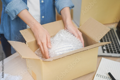 Small business entrepreneur SME, hand of woman owner packing product, checking parcel before into cardboard box after receive order from customer, working at home office. Merchant online, ecommerce.
