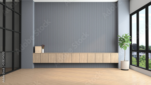 Modern empty room with gray slat wall and built-in wooden cabinet. 3d rendering
