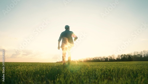 agriculture. man farmer a agronomist sunset walk green field of wheat grass. agriculture farming business concept. male farmer silhouette at walk. agriculture healthy food business farming concept