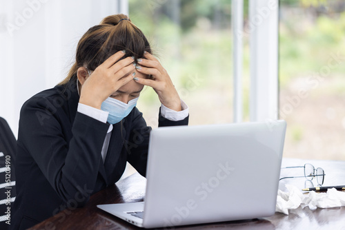 Female employee wearing a medical mask while working alone, Sickness while working.