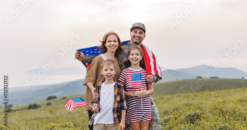 Happy man soldier reunited with his patriotic american family