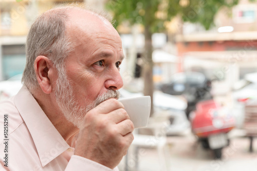 close-up profile portrait of an older man drinking his cup of coffee or tea