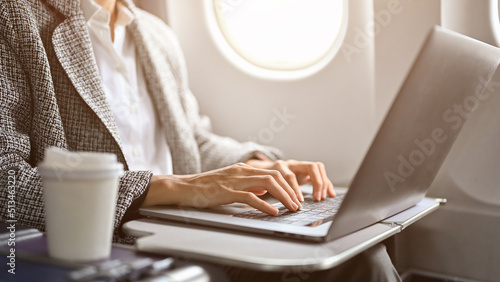 #560425400Gorgeous businesswoman on the plane in a business class seat, using laptop computer