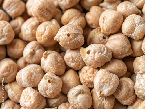 Holes in chickpea beans bored of larvae weevil macro. Dry chickpeas infested with wheat weevil Sitophilus granarius. Raw legume bobs damaged with grain insect. Food spoilage beetle.