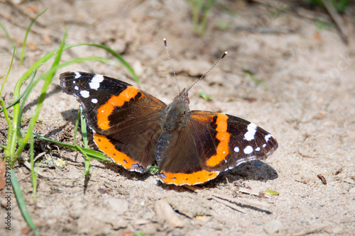 Red Admiral butterfly on sandy ground