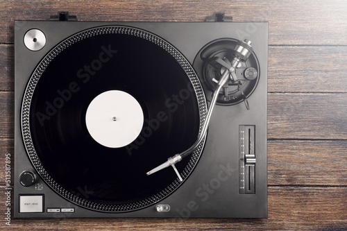 Vintage retro turntable vinyl record player with black vinyl on a table