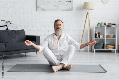 bearded guru coach meditating in easy pose with closed eyes in living room.