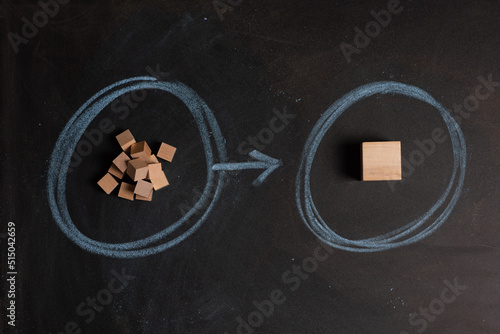 A chalkboard illustrates the concept of progression from complex and unorganized to simple and organized. Taking a complex idea and making it easy to understand.