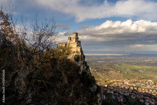 View of the Guaita fortress on the mountain edge against the cloudy blue sky. San Marino, Italy.