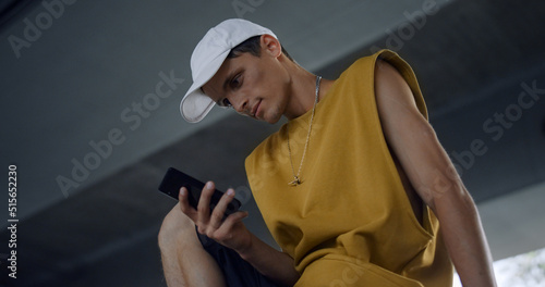 Cheerful hipster looking smartphone screen. Handsome guy watching video