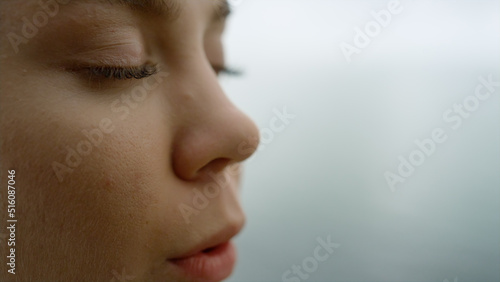 Portrait woman breathing deeply doing yoga exercise outside with closed eyes.