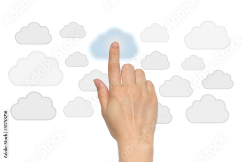Cloud computing concept with woman hand on white background.