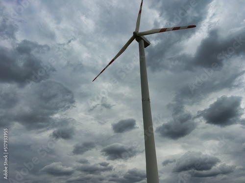 WIATRAK NA TLE POCHMURNEGO NIEBA. TURBINA WIATROWA.