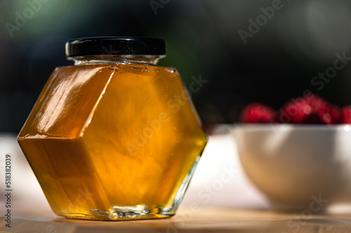 Miód malinowy w ładnym słoiku. Miód z malinami. Maliny i miód. Eko miód. Miód w słoiku. Miód na prezent. Prezentowy słoik miodu. Hexagon. Malinowy deser. Płynny miód pszczeli