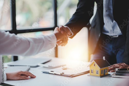 Handshake real estate agents deliver sample homes to customers. mortgage loan agreement Make a contract for hire purchase and sale of a house. and home insurance contracts home mortgage loan concept