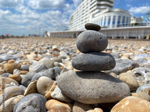 Stone balance rocks on pebble beach in St leonards on sea, Hastings, East Sussex UK