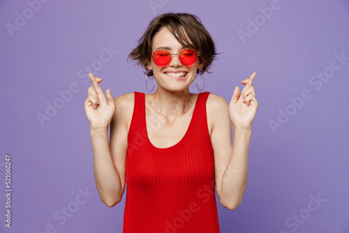 Young fun woman 20s she wear red tank shirt eyeglasses waiting for special moment, keeping fingers crossed, making wish, eyes closed isolated on plain purple backround studio People lifestyle concept