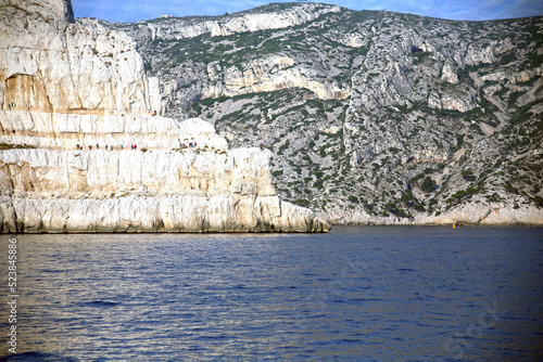 Seafront view of the rugged rock faces of the Calanques coast, Marseille, France