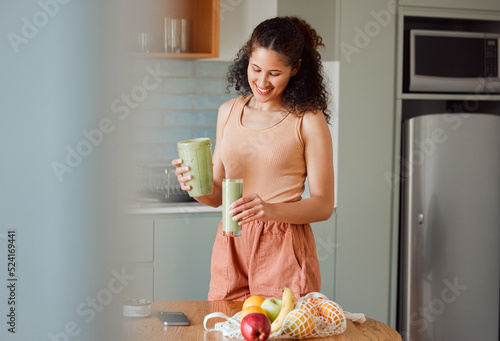 Healthy lifestyle, organic smoothie and clean eating dieting woman with fresh fruits, vegetables and consumables. Wellness detox, nutrition and body or weight watching vegan drinking juice or shake