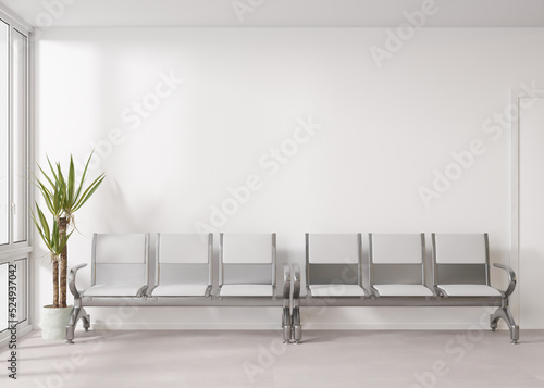 Empty white wall in modern public space. Mock up for advertisement. Free, copy space for your billboard. White waiting room with empty space for signboard, poster. 3D rendering.