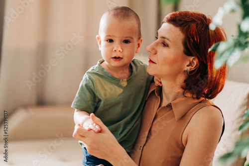 Cute little kid child boy with adult mum enjoying time at home. Family love relations and maternity happiness