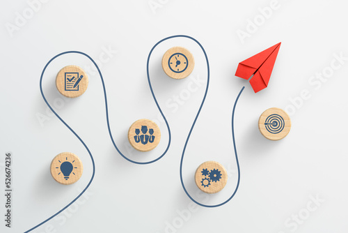 Red paper plane and wooden cubes with business strategy icons on white background