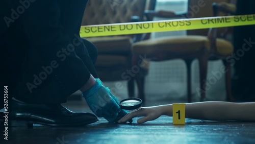 Detective Collecting Evidence in a Crime Scene. Forensic Specialists Making Expertise at Home of a Dead Person. Homicide Investigation by Professional Police Officer.