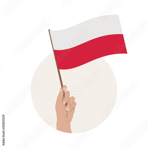 Biało-czerwona flaga w uniesionej dłoni. Flaga Polski. Ilustracja wektorowa. Narodowe Święto Niepodległości.