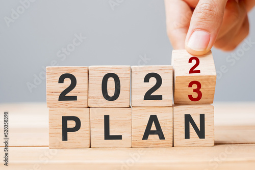 hand flipping block 2022 to 2023 PLAN text on table. Resolution, strategy, goal, motivation, reboot, business and New Year holiday concepts