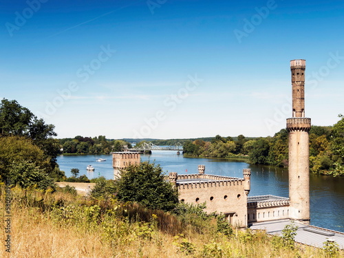 Berlin Brandenburg und Potsdam. Dampfmaschinenhaus und Glienicker Brücke am Ufer zwischen Griebnitzsee und Glienicker Lake
