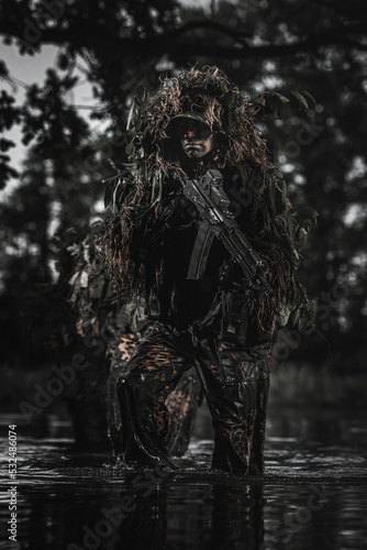 Eastern special forces soldier with rifle in the jungle