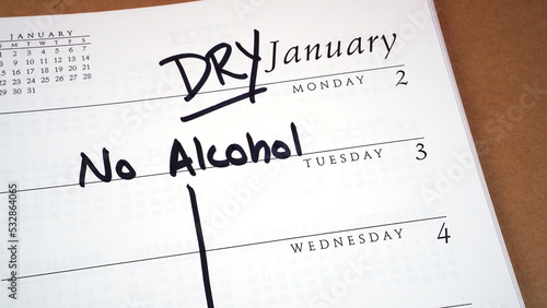 Calendar marked to indicate that January is Dry January - a month to stay sober and alcohol-free.