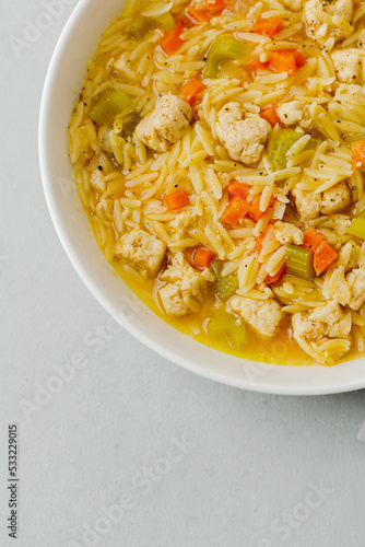 Overhead View of a Bowl of Vegan "Chicken" Soup