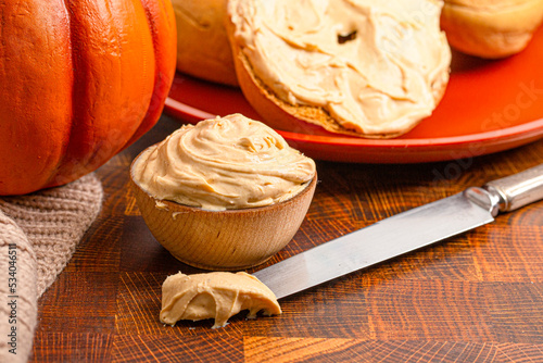 Bowl of Pumpkin Cream Cheese for a Pumpkin Bagel on a Wooden Table
