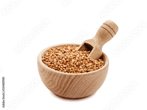 Kasza gryczana prażona w drewnianej misce z łopatką na białym tle