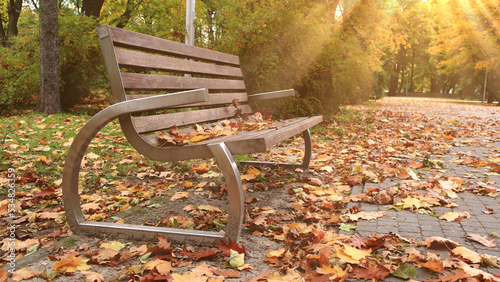 a bench in the autumn park lit by the soft rays of the sun ławka w jesiennym parku oświetlona delikatnymi promieniami słońca