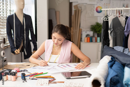 Young fashion designer woman drawing sketches pattern clothes. female tailor thinking and design idea concept, dressmaker working in workshop studio desk. SME small business owner self-employed.