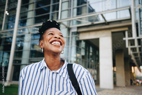 Young ambitious black businesswoman smiling happily while commuting to work in the morning