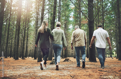 Family, friends and forest adventure with parents and adult children walking in nature for outdoor hiking, fun and trees on wellness vacation. Running, couple and travel men and women in woods