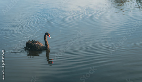Czarny łabędź pływający po stawie wczesnym rankiem.