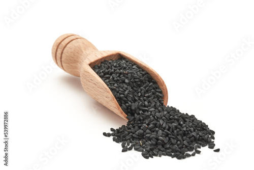 Czarnuszka ziarna na drewnianej łopatce rozsypany na białym tle