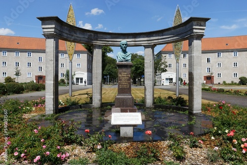 Rathenow: Dunckerplatz mit Denkmal von Johann Heinrich August Duncker, dem Begründer der optischen Industrie, Blick in Richtung Friedrich-Ebert-Ring